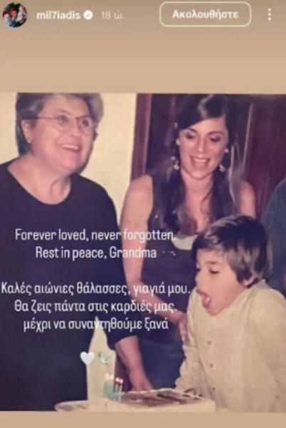 Ο γιος του προέδρου της ΠΑΕ Ολυμπιακός, Μιλτιάδης Μαρινάκης, θέλησε να αποχαιρετήσει τη γιαγιά του μέσα από μια συγκινητική ανάρτηση στους προσωπικούς του λογαριασμούς στα μέσα κοινωνικής δικτύωσης.