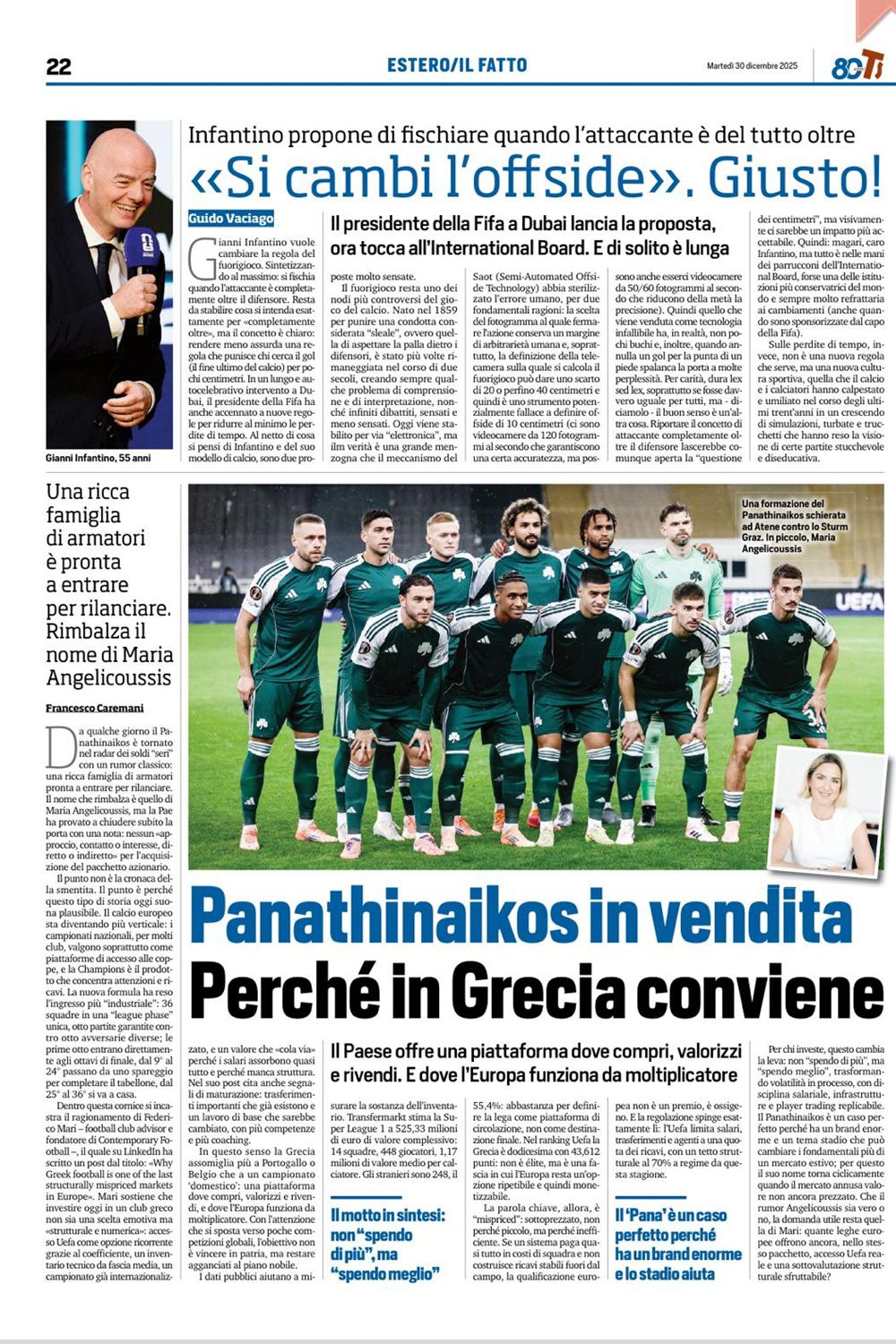 Ιδιαίτερη αναφορά γίνεται στο όνομα της Μαρίας Αγγελικούση, χωρίς ωστόσο να υπάρχει επίσημη επιβεβαίωση ή τοποθέτηση. Όπως σημειώνεται, η πιθανή εμπλοκή μίας τόσο ισχυρής εφοπλιστικής οικογένειας υπογραμμίζει την ελκυστικότητα του εγχειρήματος, το οποίο αντιμετωπίζεται ως επένδυση με προοπτική και όχι ως προσωπικό στοίχημα. Καταλήγοντας, η Tuttosport επισημαίνει ότι το ελληνικό ποδόσφαιρο, παρά τα προβλήματα κακοδιαχείρισης και εσωστρέφειας του παρελθόντος, προσφέρει σήμερα σημαντικές ευκαιρίες. Όπως συνέβη στο παρελθόν με χώρες όπως η Πορτογαλία και το Βέλγιο, έτσι και η Ελλάδα μπορεί να λειτουργήσει ως ενδιάμεσος σταθμός δημιουργίας αξίας στο ευρωπαϊκό ποδοσφαιρικό οικοσύστημα. Ο Παναθηναϊκός, σύμφωνα με το ιταλικό δημοσίευμα, δεν αποτελεί απλώς έναν σύλλογο προς πώληση, αλλά ένα ολοκληρωμένο επενδυτικό case σε μία αγορά που, αυτή τη στιγμή, δείχνει να συμφέρει.
