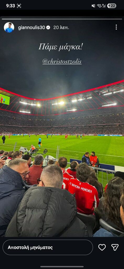 Στις εξέδρες της Allianz Arena βρίσκεται, μεταξύ άλλων, ο Γιαννούλης, με σκοπό φυσικά να στηρίξει τον πρώην συμπαίκτη του στον ΠΑΟΚ.