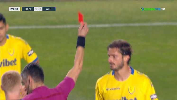 Με 10 παίκτες συνεχίζει ο Παναιτωλικός απέναντι στον Ατρόμητο, μετά το σκληρό μαρκάρισμα που έφερε την αποβολή του Μάριου Οικονόμου στο 30ο λεπτό.
