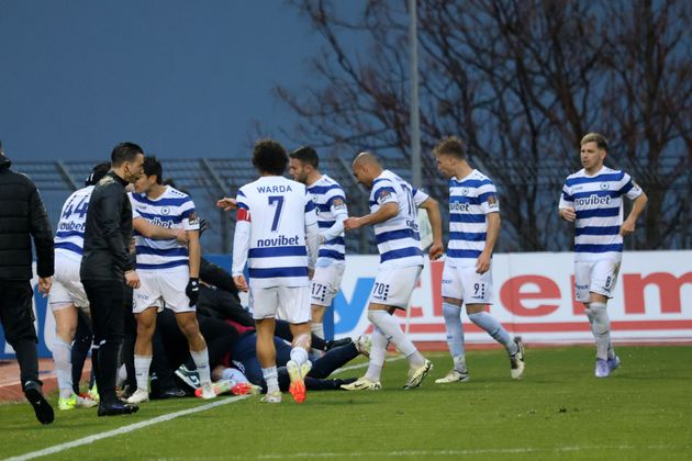 Ο Μάριος Ηλιόπουλος πανηγύρισε με την ψυχή του τη νίκη της ΑΕΚ επί του Ατρόμητου και αγκάλιασε Ματίας Αλμέιδα και παίκτες.