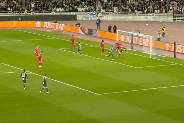 Η Τετέ έπεσε μέσα στην περιοχή και οι πράσινοι διαμαρτυρήθηκαν για πέναλτι, με το ματς να συνεχίζεται κανονικά.