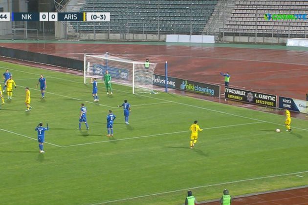 «Κλειδώνει» τη νίκη ο Άρης απέναντι στη Νίκη Βόλου με δεύτερο γκολ του Ντάριντα, μετά από σέντρα του Σαβέριο.