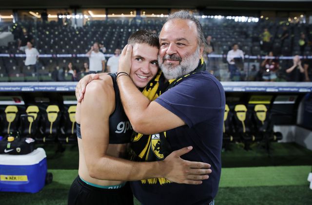 Μετά την νίκη της ΑΕΚ κόντρα στον Παναιτωλικό, ο Μάριος Ηλιόπουλος μπήκε στον αγωνιστικό χώρο της Opap Arena και αγκάλιασε τον Δημήτρη Καλοσκάμη όπως και άλλους παίκτες της Ένωσης.