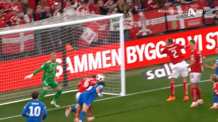 Μία απίθανη απόκρουση έκανε ο Κωνσταντής Τζολάκης στο Ελλάδα - Δανία, διώχνοντας την μπάλα με το πόδι.