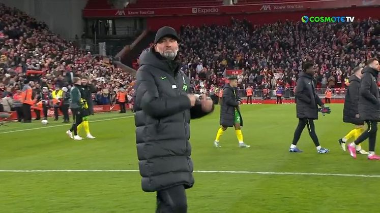 Ο Γιούργκεν Κλοπ μόλις άκουσε από τους φίλους της Λίβερπουλ στην αναμέτρηση με την Νόριτς να λένε το τραγούδι του, γύρισε προς το μέρος τους και σχημάτισε μια καρδιά.
