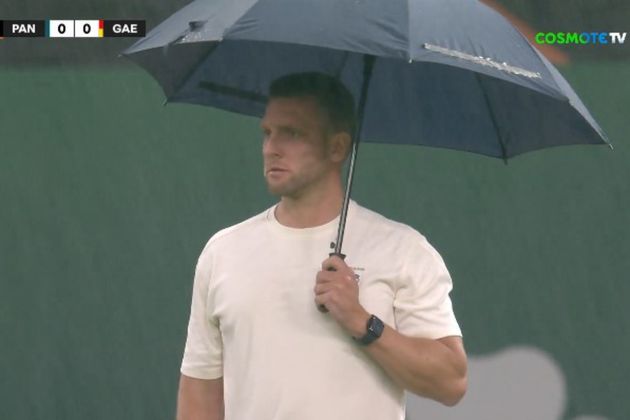VIDEO Ο προπονητής της Γκόου Αχέντ Ιγκλς με ομπρέλα στο ΟΑΚΑ την ώρα του αγώνα