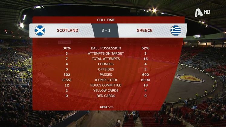 Οι Σκωτσέζοι κέρδισαν πέναλτι μετά από μαρκάρισμα του Ρότα στον ΜακΤόμινεϊ, που ανέλαβε και την εκτέλεση και νίκησε τον Τζολάκη για το 0-1.