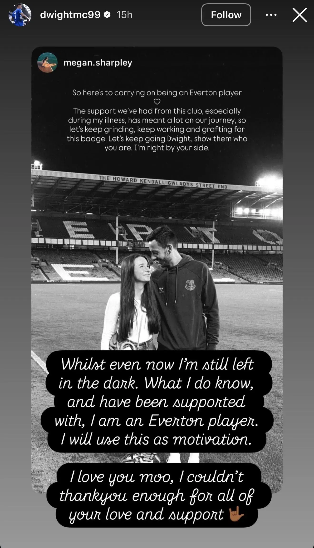 Παρά την πικρία, δεν παρέλειψε να ευχαριστήσει την Έβερτον για τη στήριξή της, ιδίως κατά τη διάρκεια μιας εξαιρετικά δύσκολης προσωπικής περιπέτειας το 2023, όταν η ίδια υποβλήθηκε σε επείγουσα χειρουργική επέμβαση. Τόνισε πως ο σύλλογος στάθηκε στο πλευρό τους και δήλωσε πως τόσο εκείνη όσο και ο Μακνίλ είναι έτοιμοι να συνεχίσουν να «παλεύουν» για τη φανέλα της ομάδας.