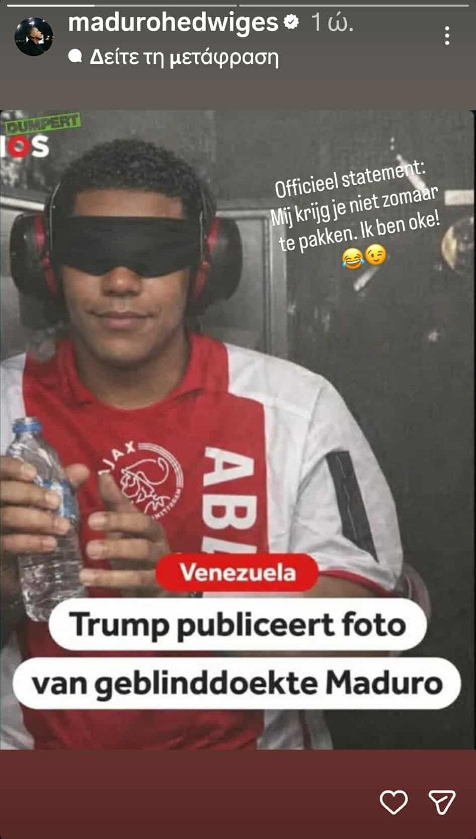 Στη χιουμοριστική εικόνα που δημιούργησε, ο βετεράνος ποδοσφαιριστής πρόσθεσε τον τίτλο: «Ο Τραμπ δημοσιεύει φωτογραφία του Μαδούρο με δεμένα μάτια». Παράλληλα, ο ίδιος ο Μαντούρο σχολίασε με χιούμορ ως ο... συλληφθείς: «Επίσημη δήλωση: Δεν με πιάνεις έτσι εύκολα. Είμαι καλά».