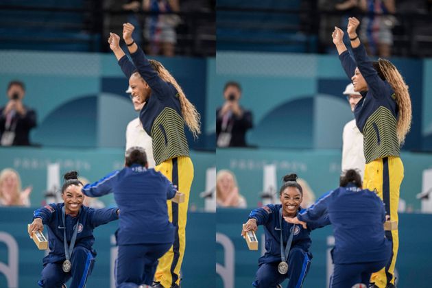 Η Σιμόν Μπάιλς και η Τζόρνταν Τσάιλς υποκλίθηκαν στην Ρεμπέκα Αντράντε, κατά τη διάρκεια της απονομής των μεταλλίων μετά τον τελικό στις ασκήσεις εδάφους στους Ολυμπιακούς αγώνες του Παρισιού.