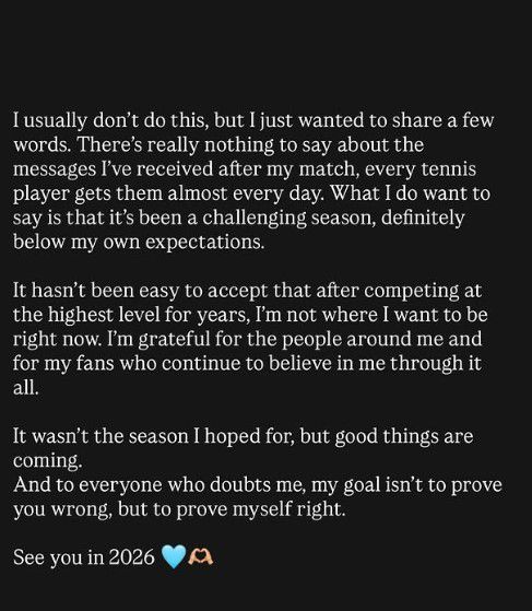 «Συνήθως δεν το κάνω αυτό, αλλά ήθελα απλώς να μοιραστώ λίγα λόγια. Δεν υπάρχει πραγματικά τίποτα να πω για το μήνυμα που έλαβα μετά τον αγώνα μου, κάθε τενίστας τα λαμβάνει καθημερινά. Αυτό που θέλω να πω είναι ότι ήταν μια δύσκολη σεζόν, σίγουρα από την πλευρά των δικών μου προσδοκιών. Δεν ήταν εύκολο να το αποδεχτώ αυτό, μετά από χρόνια συμμετοχής σε αγώνες υψηλού επιπέδου. Είμαι ευγνώμων στους ανθρώπους γύρω μου και στους οπαδούς μου που συνεχίζουν να πιστεύουν σε μένα. Δεν ήταν η σεζόν που ήλπιζα, αλλά έρχονται καλά πράγματα. Και σε όλους όσους αμφιβάλλουν για μένα, ο στόχος μου είναι να αποδείξω ότι έχετε δίκαιο. Τα λέμε το 2026», έγραψε η Ελληνίδα αθλήτρια.